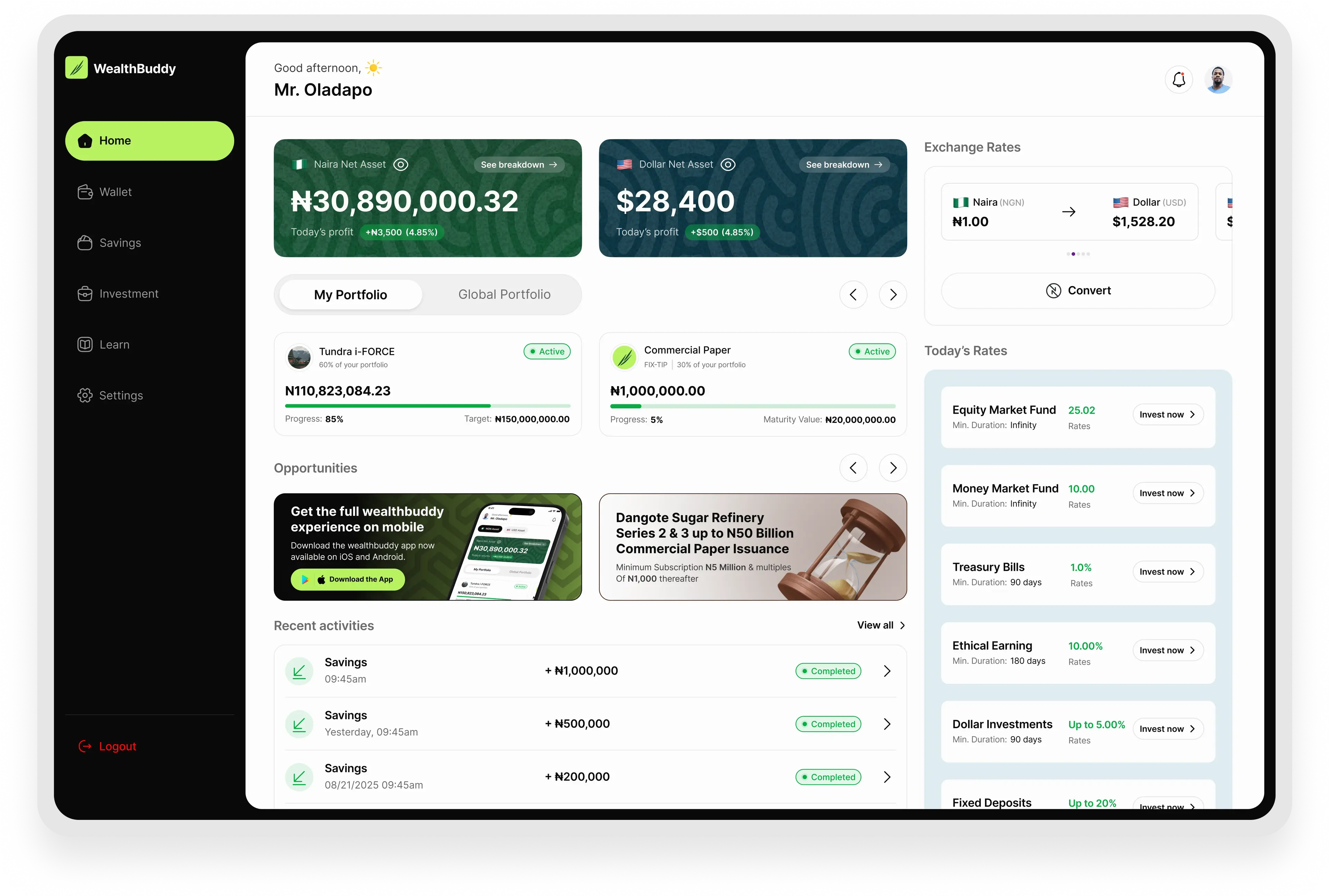 Get a real-time view of your wallets, savings, investments, and market opportunities all from your personalized WealthBuddy dashboard.